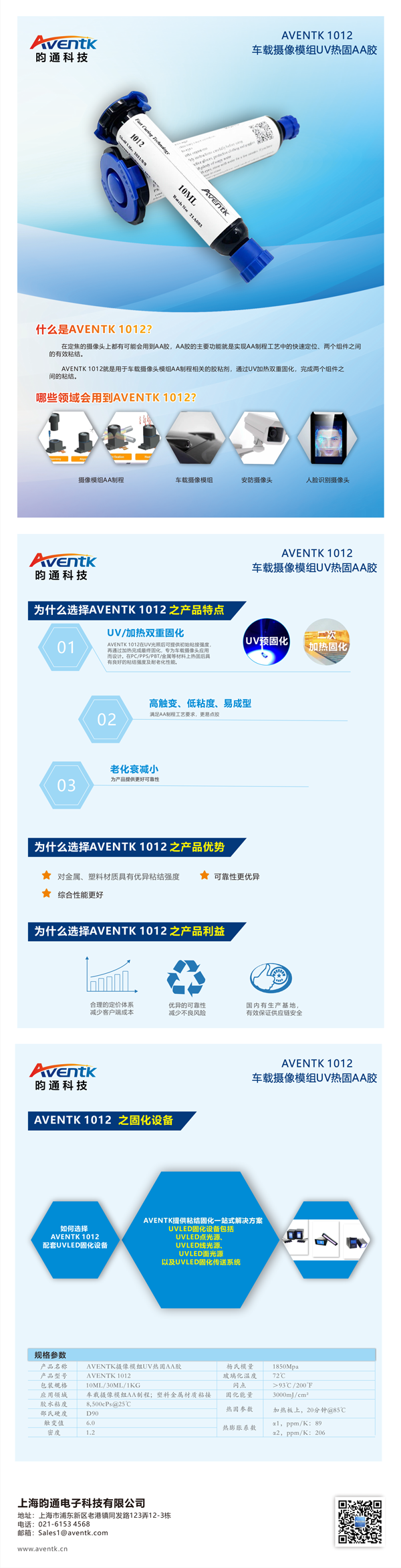 AVENTK 1012系列AA膠水,這是一款通過(guò)UV預固化定位,再通過(guò)加熱完成最終固化的膠水,適用于車(chē)載攝像模組以及安防攝像模組。AVENTK 1012系列攝像模組AA膠具有高觸變、易成型的特點(diǎn),可滿(mǎn)足AA制成工藝;膠水粘度低,更容易點(diǎn)膠;同時(shí)膠水老化衰減小,能夠為產(chǎn)品提供更好的可靠性。