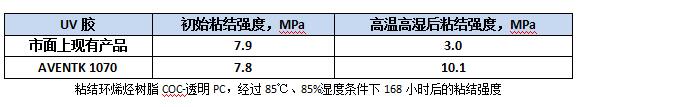 AVENTK 1070具有優(yōu)異的耐高溫高濕性能,實(shí)驗中,將初始粘結好的環(huán)烯烴樹(shù)脂COC-透明PC件,經(jīng)85℃、85%濕度條件下168小時(shí),粘結強度可達到10.1MPa,可滿(mǎn)足高溫高濕測試的要求。