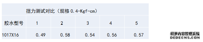 1、膠水粘接強度適中,比客戶(hù)要求的0.4Kgf的扭力要求,客戶(hù)測試數據如下表: