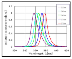 如下圖所示,一般來(lái)講,固化材料的光引發(fā)劑有許多不同種類(lèi),而且基本都有一個(gè)較寬的吸收波譜,有些有峰值,有些是平滑的曲線(xiàn);而UV LED固化設備的吸收峰則不同,一般是一個(gè)單峰,范圍也只有±5nm。