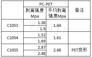 上圖是選擇的三種不同的樹(shù)脂,選擇這三種樹(shù)脂主要是因為C1053、C1054、C1055都是脂肪族聚氨酯丙烯酸酯,分子中柔性的脂肪長(cháng)鏈提供膠層良好的柔韌性與延展性,可以平衡彈性模量,能有效的傳遞熱固化效應與熱效應,使內應力分配均勻,達到降低收縮應力的效果,提高膠黏劑的附著(zhù)力。還有一些分子量較低的脂肪族聚氨酯丙烯酸酯,其柔性鏈段較短,硬段含量較大,固化時(shí)體系交聯(lián)度較大,鏈段間內應力相對較大,附著(zhù)力相比差了許多。