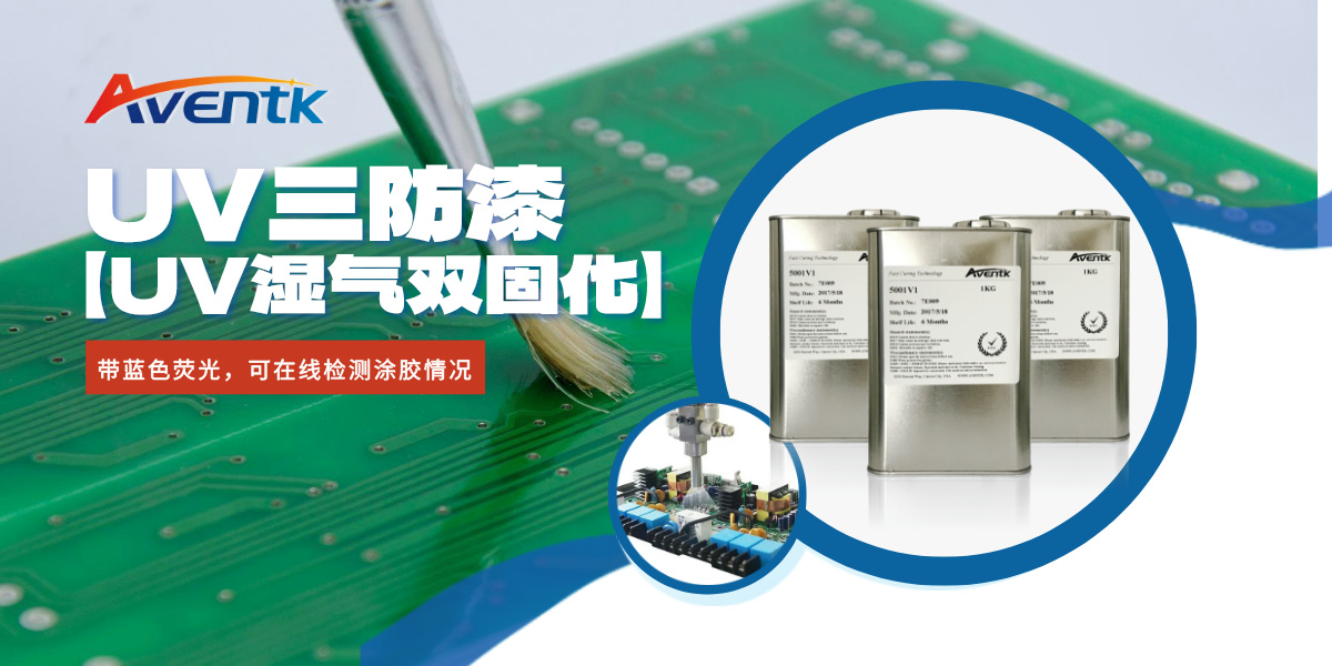 1. AVENTK 5001系列UV濕氣雙固化三防膠:這款UV三防膠主要用于PCB保護,不含有機溶劑,約100%固含;UV固化后能對陰影區進(jìn)行二次濕氣固化,在黑燈下具有亮藍熒光色,方便在線(xiàn)檢測,膠水符合UL標準。