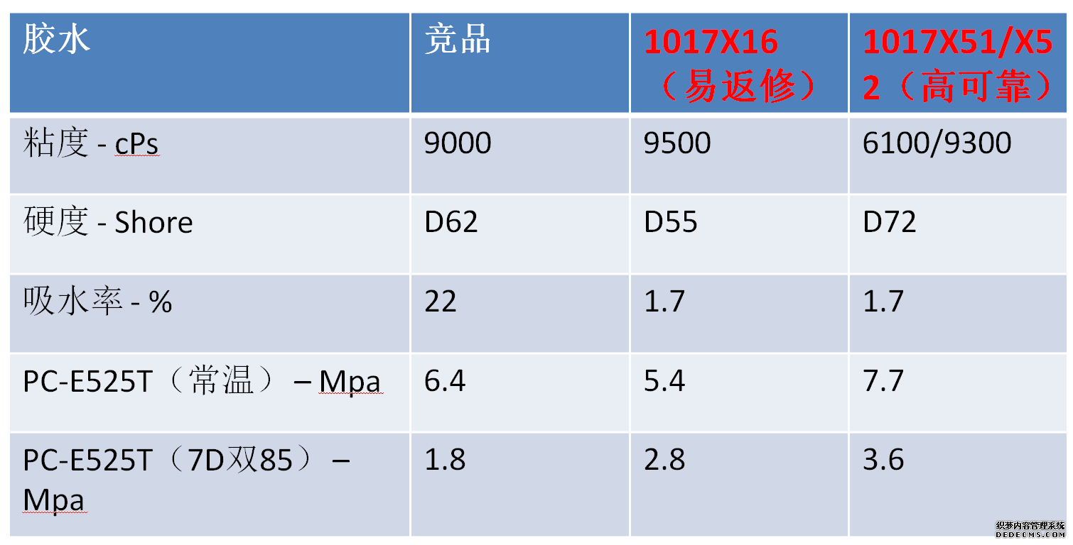 以上2種方案均給客戶(hù)提供了選擇,同時(shí)都可以改善客戶(hù)目前制程中遇到的問(wèn)題。對于方案一,可以大幅提高產(chǎn)線(xiàn)的返修良率,按每月30KG的產(chǎn)能計,節約成本過(guò)百萬(wàn);對于方案二,不僅大幅提高了耐候性能,常溫的粘接性能也提高約20%,對產(chǎn)品的可靠性和穩定性均更優(yōu)保證。